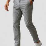 Características funcionais ajudam no uso e cuidado diário. As calças incluem um fecho com zíper e um botão seguro, além de passadores para cinto para ajuste adicional. Os bolsos frontais inclinados permitem fácil acesso a pequenos itens, e os bolsos traseiros com acabamento têm fecho com botões para manter o conteúdo seguro. O tecido misto resiste a rugas e mantém a dobra prensada, o que reduz a necessidade de passar frequentemente.