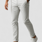 Estas calças de negócios de corte slim têm um design ajustado que cria uma silhueta limpa. São feitas de uma mistura de tecidos suaves que oferece movimento e leve elasticidade. O design mantém as linhas suaves e reduz o volume na zona dos quadris e coxas, enquanto a perna afunilada proporciona um acabamento limpo no tornozelo.