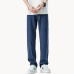 Calças leves de perna reta feitas de uma mistura de denim. Estas calças têm uma cintura baixa e um corte relaxado nas ancas e coxas. O tecido tem uma textura suave e um peso leve para ajudar a reduzir o volume, mantendo a silhueta arrumada.