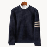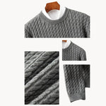 O suéter de gola redonda é feito com uma malha chunky de 3 gauge. A malha confere estrutura à peça e um leve estiramento. Os acabamentos canelados na gola, punhos e barra ajudam o suéter a manter a sua forma e a assentar de forma elegante nas bordas. A mistura de fios é projetada para ser suave ao toque da pele, mantendo a durabilidade com o uso regular.
