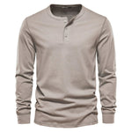 Esta camisa Henley de manga longa tem um colarinho Henley clássico e um ajuste casual. O tecido é respirável e tem uma sensação leve para ajudar o ar a circular pela pele. A abertura com botões permite ajustar a linha do pescoço para conforto e controle de temperatura.
