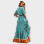 • Padrão floral Boho colorido: Confere ao vestido uma aparência vibrante e veranil.