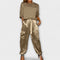Este conjunto de duas peças, feito de um tecido respirável e macio, oferece um visual elegante e versátil, adequado tanto para o dia como para a noite. A blusa de manga curta confere um toque de elegância refinada, enquanto as calças soltas garantem máximo conforto e liberdade de movimento.