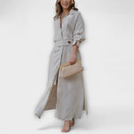 O design solto com decote em V feminino e elegante comprimento maxi proporciona um agradável conforto ao vestir, enquanto o linho respirável é ideal para dias quentes. Seja à beira-mar, num jantar ao ar livre ou num passeio pela cidade – este vestido adapta-se à sua vida.