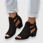 Elegantes com saltos grossos, biqueira aberta e design recortado. O fecho de correr no calcanhar proporciona um ajuste seguro e um visual moderno.