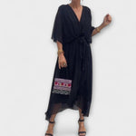 Vestido leve e elegante com decote em V e cinto na cintura, perfeito para dias quentes de verão. O comprimento midi fluido oferece tanto conforto como estilo sem esforço, ideal para ocasiões descontraídas ou passeios na praia.